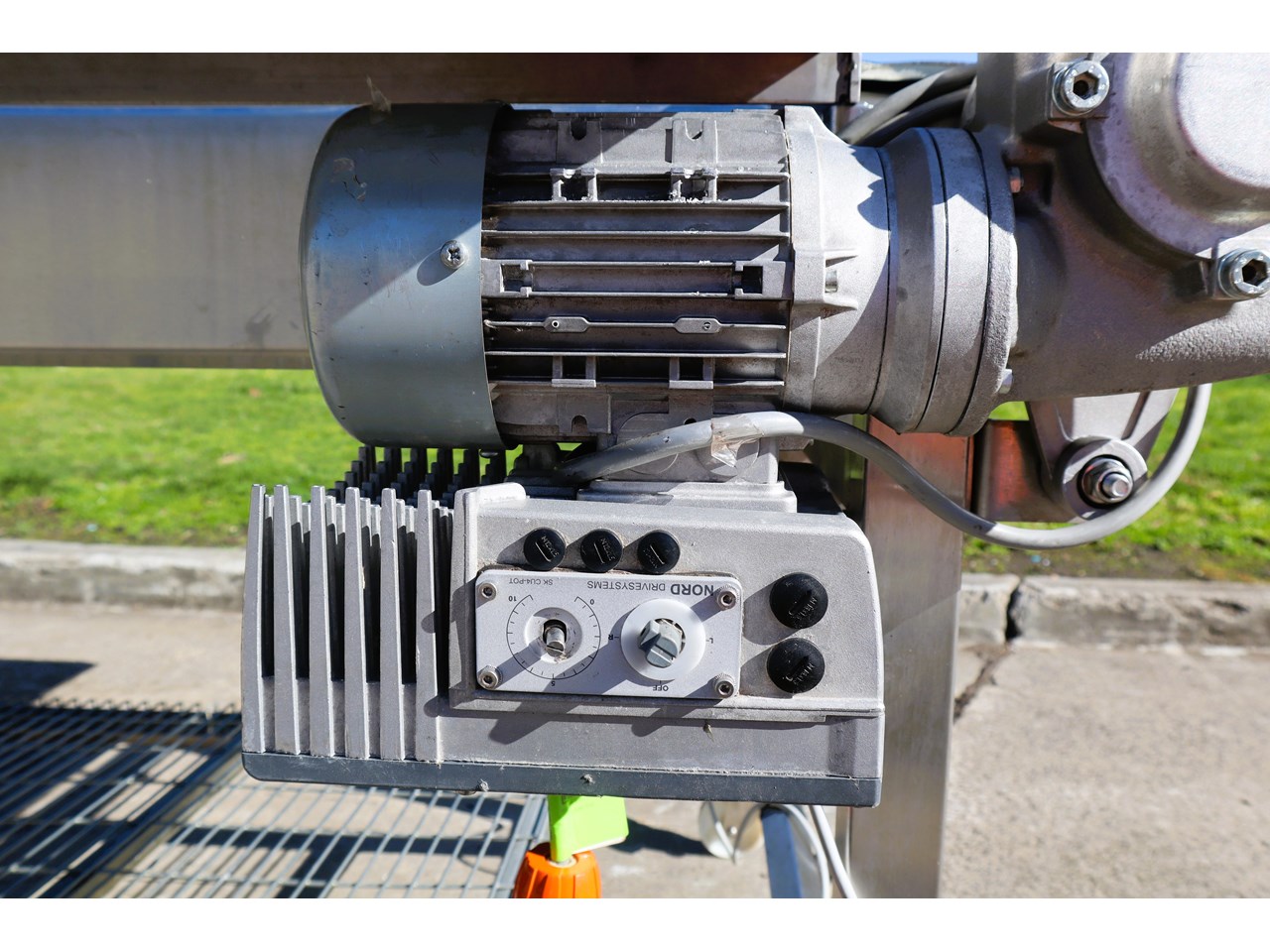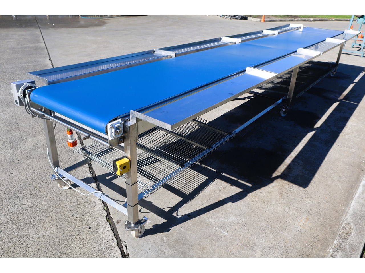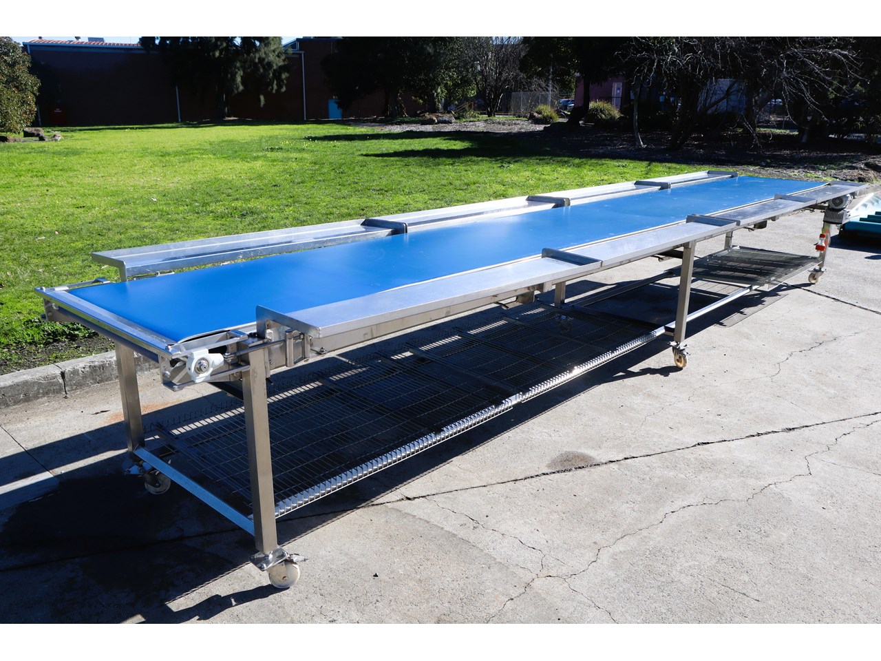 Motorised and with a stainless steel frame, this conveyor is in excellent condition. It comes with stainless steel trays that can be mounted on the sides and has a VSD installed.